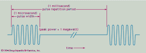 最常见的雷达信号类型由一系列重复的短时脉冲组成。该图显示了正弦波脉冲的简单表示,该脉冲可能由专为飞机探测而设计的中程雷达的发射器产生。图中的正弦波表示发射器输出电压随时间的变化。图中括号中给出的数字仅用于说明,不一定是任何特定雷达的数字。然而,它们类似于射程约为 50 至 60 海里(90 至 110 公里)的陆基雷达系统,例如用于机场空中交通管制的那种。图中给出的脉冲宽度为 1 微秒(10-6 秒)。应该注意的是,脉冲显示为仅包含几个周期的正弦波;但是,在具有指示值的雷达系统中,脉冲内将有 1,000 个周期。在图中,连续脉冲之间的时间为 1 毫秒(10-3 秒),对应于 1 千赫兹 (kHz) 的脉冲重复频率。脉冲的功率称为峰值功率,此处为 1 兆瓦。由于脉冲雷达不会连续辐射,因此平均功率远小于峰值功率。在此示例中,平均功率为 1 kW。平均功率(而不是峰值功率)是衡量雷达系统能力的指标。雷达的平均功率从几毫瓦到高达 1 兆瓦或多兆瓦不等,具体取决于应用。