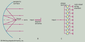 每个辐射天线元件的移相器会改变(或偏移)信号的相位,以便从特定方向接收到的所有信号彼此同步。因此,在元件处接收到的信号相加而不会产生理论损失。同样,天线的各个元件辐射的所有信号将在某个特定方向上彼此同步。改变每个元件的相移会改变天线波束的方向。这种天线称为电子控制相控阵天线。它允许在不移动大型机械结构的情况下快速改变梁的位置。在某些系统中,光束可以在微秒内从一个方向变为另一个方向。