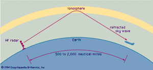 低于约 100 MHz 的频率通常不适用于雷达应用。较低频率可以提供独特而重要能力的一个例子是在无线电频段的短波或高频 (HF) 部分(从 3 到 30 MHz)。HF 频段的优点是这些频率的无线电波被电离层折射(弯曲),因此波在超出地平线的很长距离内返回地球表面,如图所示。这允许在大约 500 到 2,000 海里(900 到 3,700 公里)的距离内进行目标检测。因此,HF 超视距 (OTH) 雷达可以探测到飞机的距离,其距离是地基微波空中监视雷达的 10 倍,而地面微波空气监视雷达的范围受地球曲率的限制。除了远距离探测和跟踪飞机外,HF OTH 雷达还可以设计用于检测弹道导弹(特别是弹道导弹在穿过电离层时造成的干扰)、船只和海洋上的天气影响。海洋上的风会在水面上产生波浪,HF OTH 雷达可以识别这些波浪。从水波回波产生的多普勒频谱中,可以确定风产生的波的方向,从而确定风本身的方向。海浪的强度(表明海况或粗糙度)也可以确定。HF OTH 可以及时获得有关在大片海洋上驱动波浪的风的信息——只有通过其他方式才能非常困难地获得——事实证明,这对于天气预报很有价值。