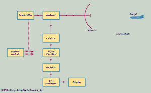 雷达是一种“主动”传感设备,因为它有自己的照明源(发射器)来定位目标。它通常在电磁波谱的微波区域运行,以赫兹(每秒周期数)为单位,频率范围从大约 400 兆赫兹 (MHz) 到 40 千兆赫 (GHz)。然而,它已被用于低频的远程应用(频率低至几兆赫兹,即 HF [高频]或短波段)以及光学和红外频率(激光雷达或激光雷达的频率)。雷达系统的电路元件和其他硬件随使用的频率而变化,系统的大小从小到可以放在手掌中的系统,到足以填满几个足球场的巨大系统。